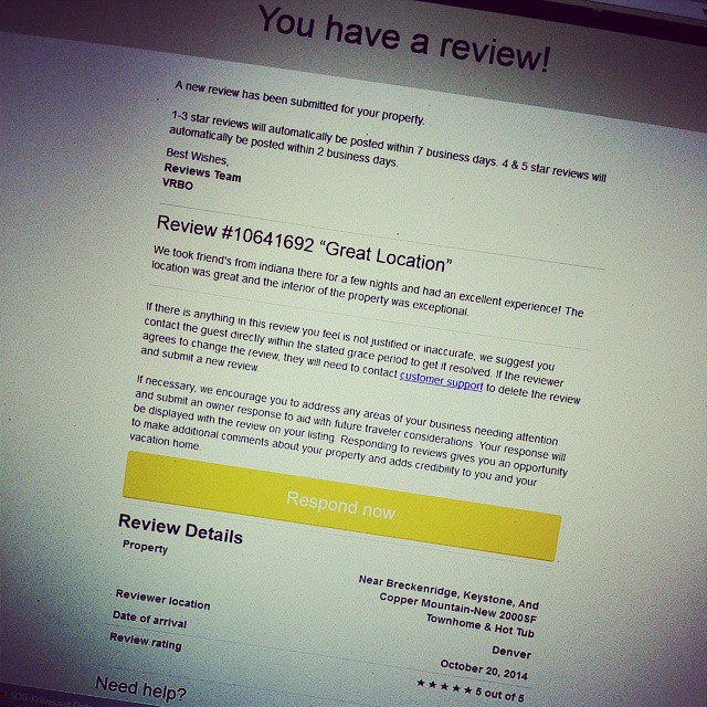 First review for lodge 50B. 5 out of 5 stars! So happy. Thank you to our folks from Indiana and Michigan! Guest said “location was great and the interior of the property was exceptional”! #vrbo #Silverthorne #Dillon #Breckeridge