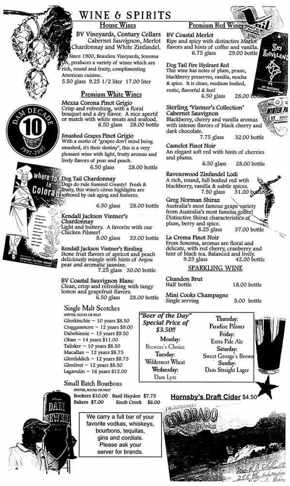 Dillon Dam Brewery Menu | ||||||
